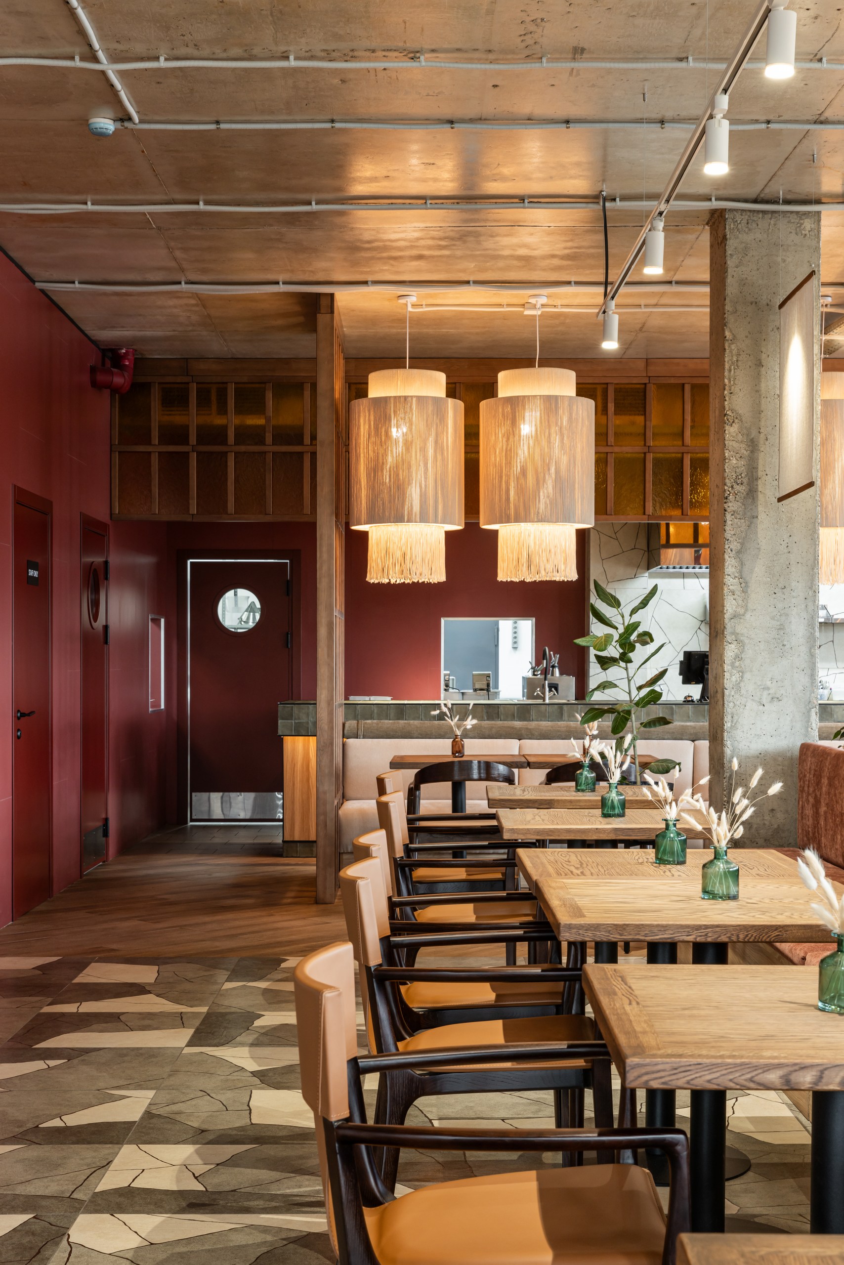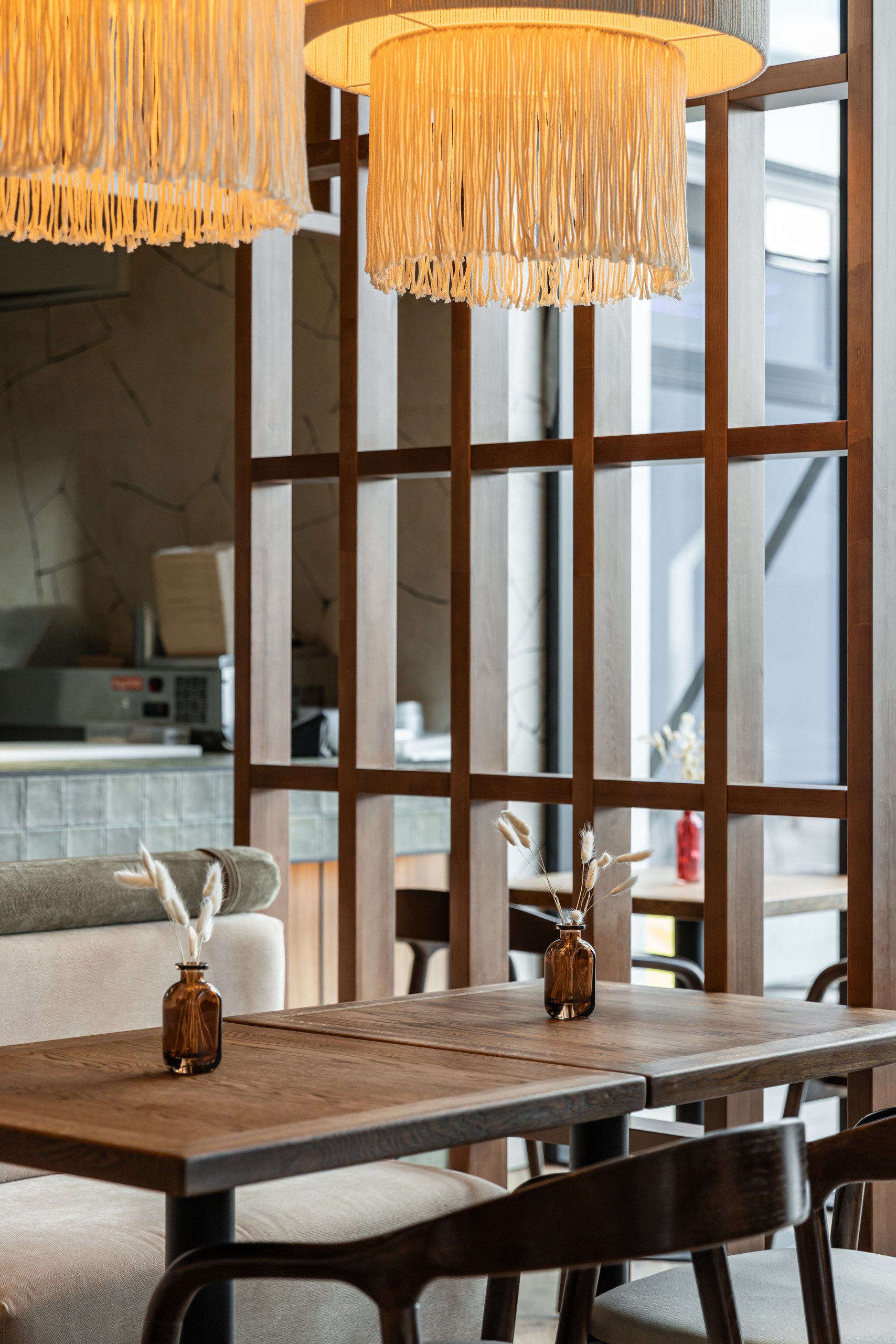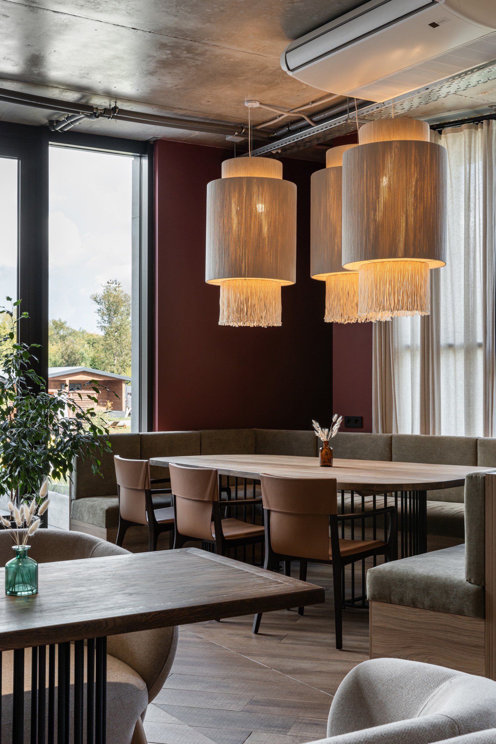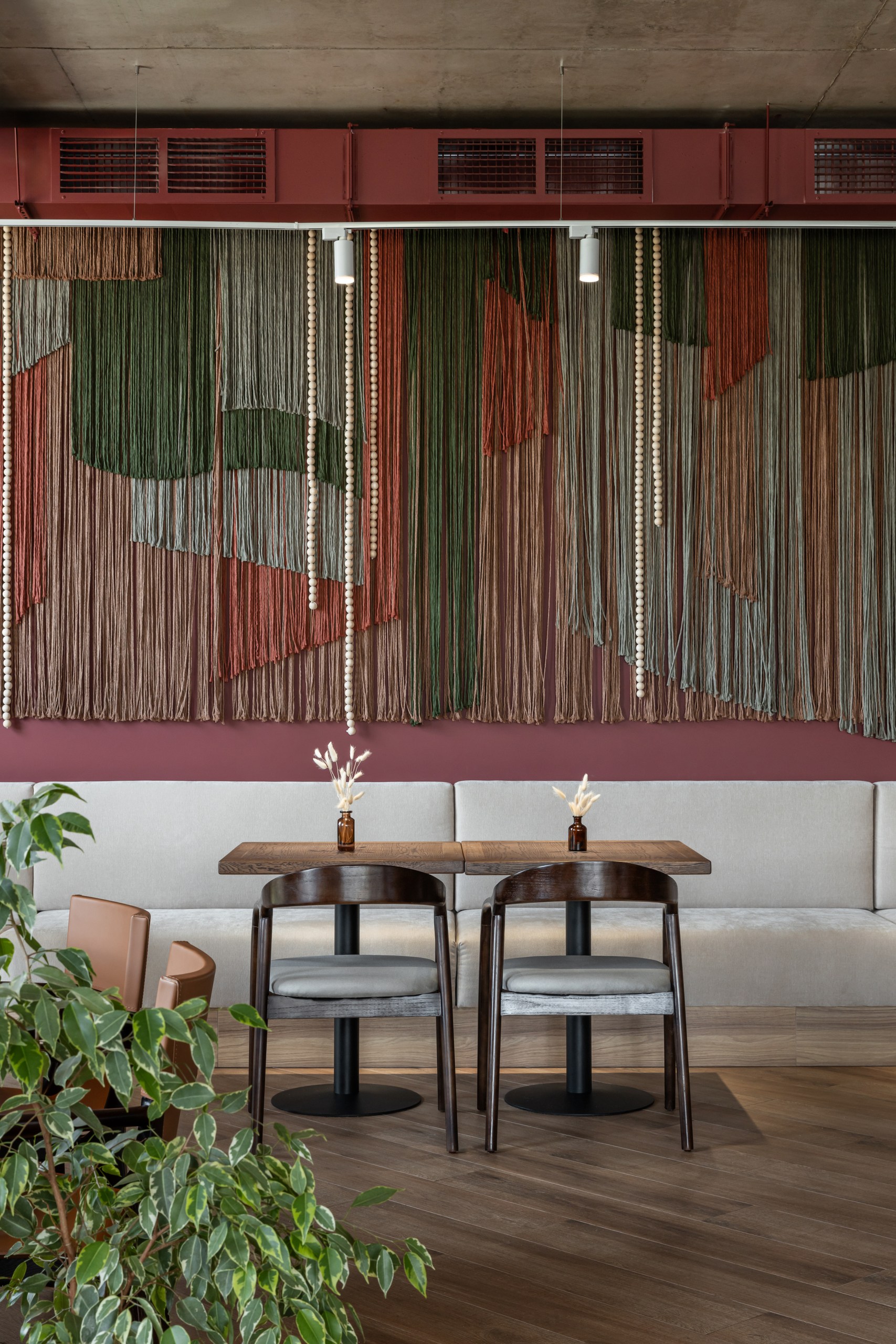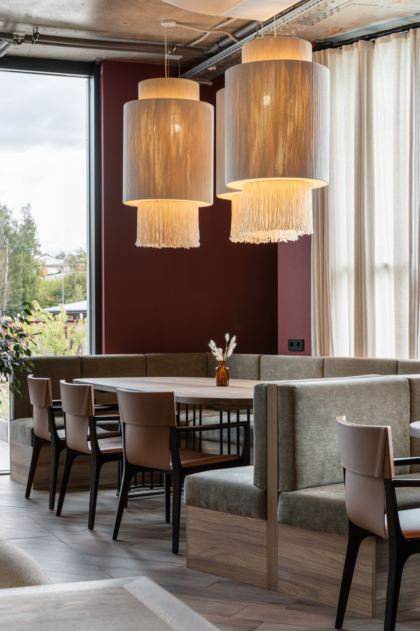 и уникальным дизайнерским решением — необычными люстрами в форме спагетти,